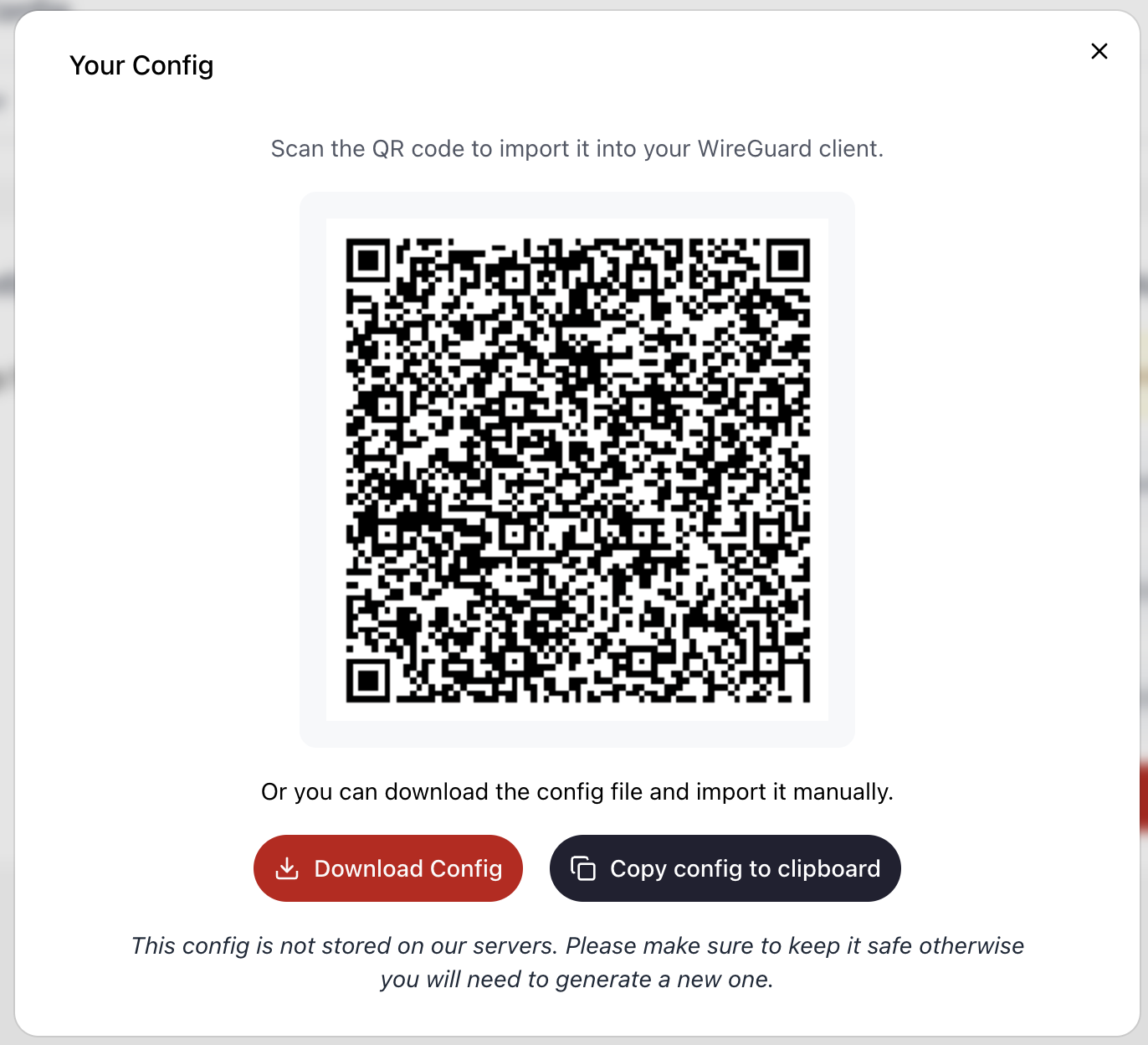 - A QR code (which can be scanned directly in the WireGuard app)